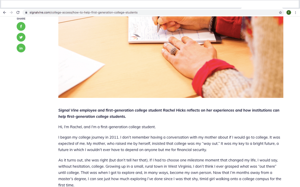 This week I was assigned to review someone else’s blog that is similar to mine. After some research to find a blog dedicated to helping first-gen students, I could only find bloggers who had just written one post about being a first-gen. The one I liked the best was from Rachel Hicks. On October 15, 2019 she made a blog post about how college has changed her and what she wish she would’ve known as a first-gen student.